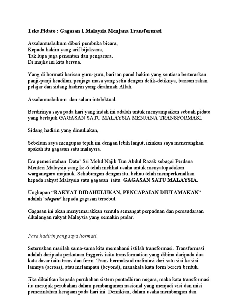 Teks Pidato Gagasan 1 Malaysia Menjana Transformasi Edit Pdf